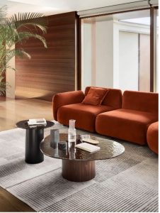 Sculptural and refined, the Mushroom Coffee and Side Tables feature bush-hammered glass tops and subtly tilted wooden bases, striking a balance between elegance and lightness.