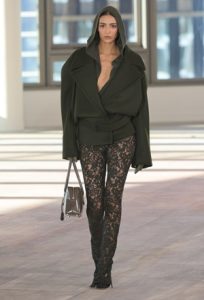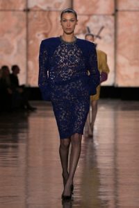 Saint Laurent leads the trend, presenting sexy silhouettes in a rich color palette. Bella Hadid walked the runway in a bright blue lace set with accentuated shoulders, while the collection also featured looks in green, yellow, and burgundy.