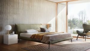 Fluff Bed: A luxurious bed in ecru fabric with a matt black frame, measuring 180 x 200 cm. The Fluff Bed combines comfort and style, making it a perfect addition to any bedroom.