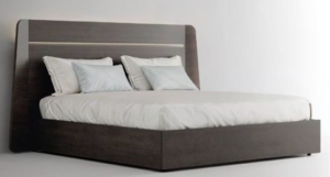 a luxurious bed featuring a dual headboard design — a soft, upholstered fabric center framed by sleek, dark wood. The space is accented with marble-effect panels, metallic lighting fixtures, and muted pastel tones, creating a serene, high-end atmosphere perfect for modern living.