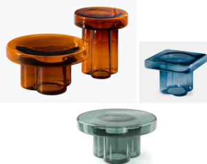 Ablos is an expression of lightness and movement, a perfect balance between strength and delicacy. Its base, formed by two curved sheets of hammered glass, supports an asymmetrical top, also in hammered glass; the play of reflections when light hits the glass creates a vibrant, ethereal atmosphere.