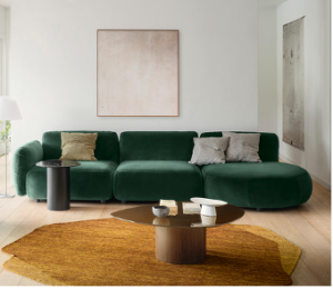 The sculptural Round Chaise Longue and matching plush pillows in the luxurious Green Hortensia fabric, offering a harmonious blend of comfort and modern design.
