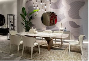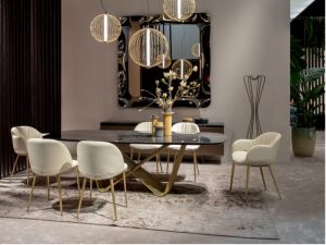 Calligaris continues its tradition of mastery with several key pieces. The Twins Dining Table, available in striking finishes including Calacatta Violet, White Travertine, and Onyx Black ceramic, is set to become a design icon. The range is complemented by the elegant Onda Dining Chair, the bold Yoroi Dining Table, and the sophisticated Sipario Mirror. For storage, the Universal Buffet Ceramic stands out as a multi-functional masterpiece, combining luxurious wood finishes with modern relief mirrors.